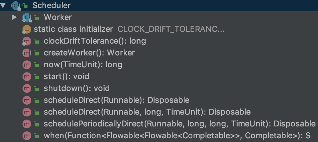 可以看到 Scheduler 下的方法不多,还有一个内部类,这些方法基本可以分为三类